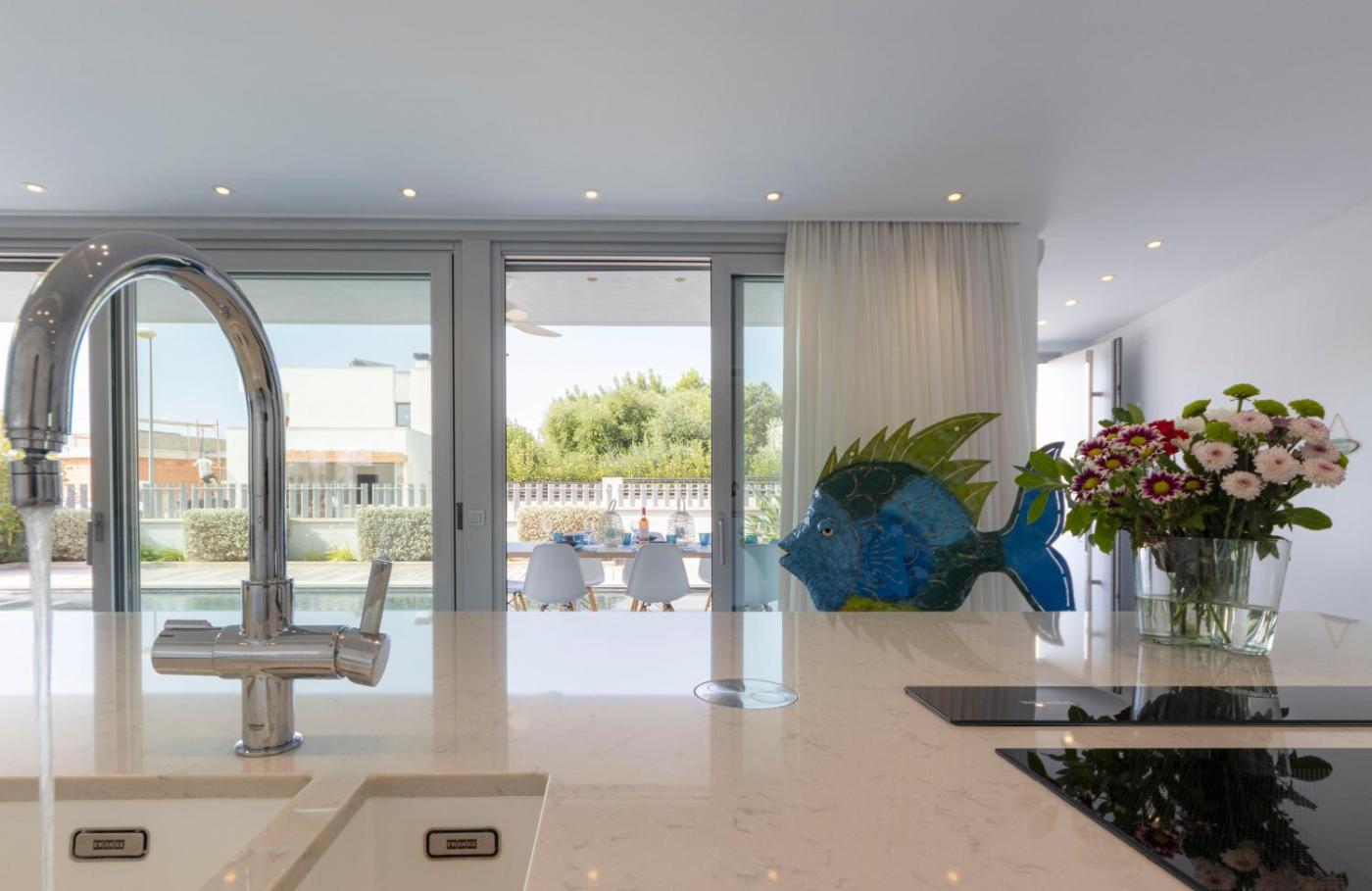 Three-Bedroom Villa. The pool with a view and fireplace are the special features of this villa. Featuring a private entrance, this air-conditioned villa comprises 1 living room, 3 separate bedrooms and 4 bathrooms with a walk-in shower and a bath. Guests will find a stovetop, a refrigerator, a dishwasher and kitchenware in the well-fitted kitchen. The villa also provides guests with a barbecue. The spacious villa provides a flat-screen TV with streaming services, a washing machine, soundproof walls, a tea and coffee maker as well as sea views. The unit offers 5 beds.